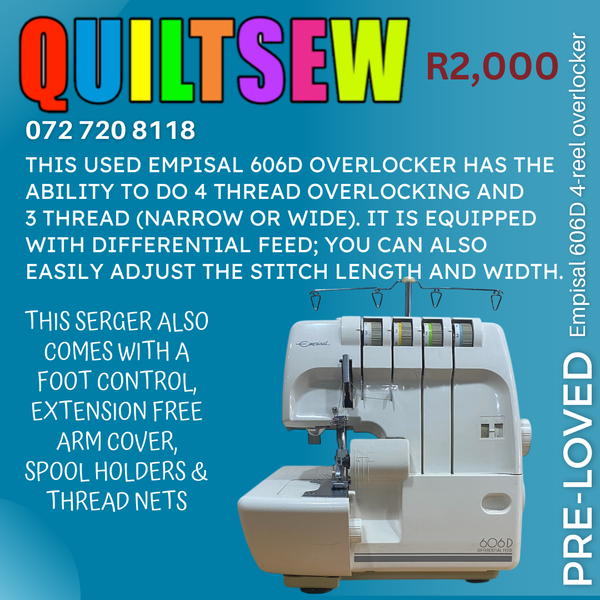 The Empisal 505D is a second hand serger is in a very good, condition. This overlocker can do 4 Thread overlocking as well as 3 thread (narrow or wide). The Empisal 505D features differential feed, which makes it perfect for sewing with difficult fabrics. The stitch length and width can be set. The Empisal overlocker is easy to operate and the thread path is marked on the thread guides.
